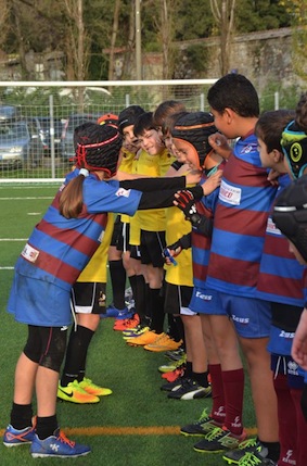 loro gruppo e si formi un cerchio. Tutti i mini-rugbisti abbracciati in